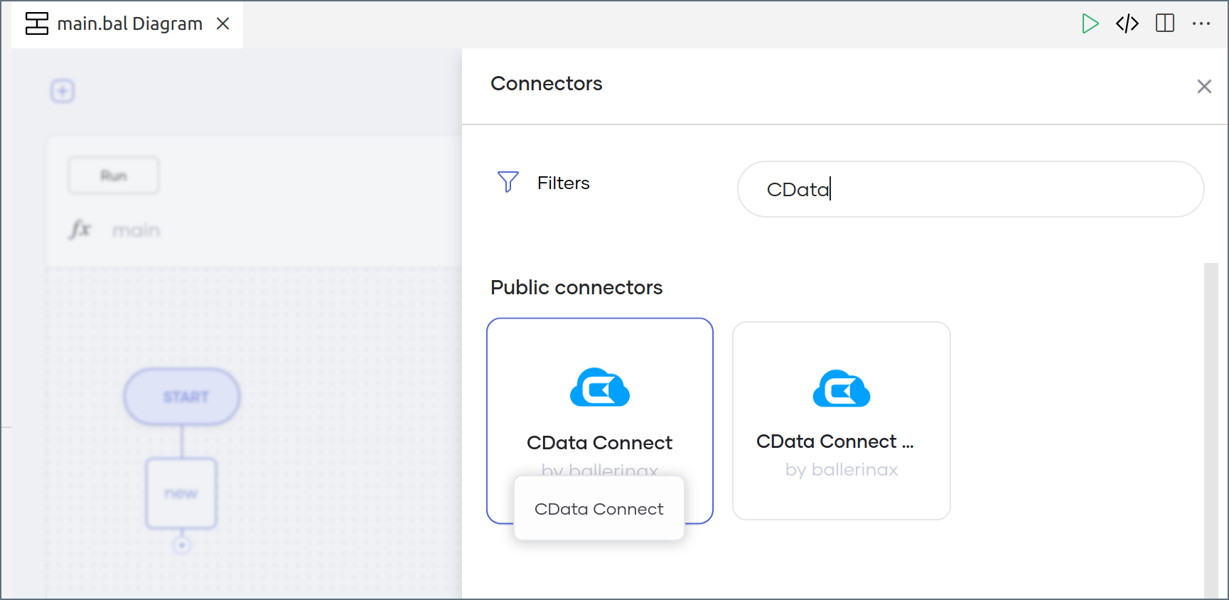 In the Connectors dialog, search for CData. Click CData Connect to open the Connector settings pane.