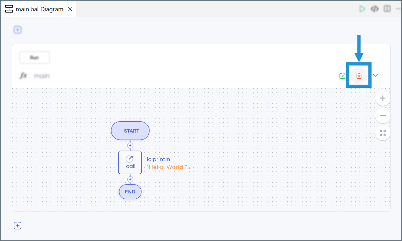 Choreo automatically generates a construct in the low-code diagram view. Delete this construct by highlighting it and clicking the delete icon.