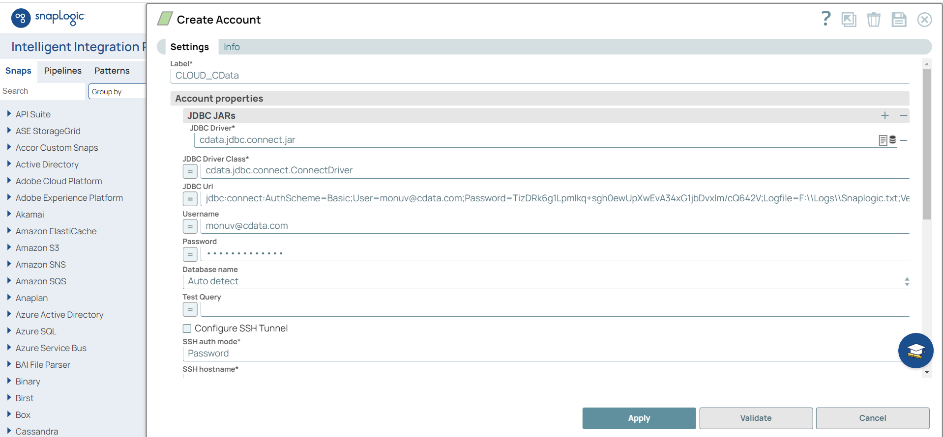 Connect AI でSnapLogic を設定して使用する前に、データソースをConnect AI アカウントに接続する必要があります。詳細は、Sources を参照してください。 You must also generate a Personal Access Token (PAT) on the Settings page. Copy this down, as it acts as your password during authentication.Download and install the Connect AI JDBC driver.a. Open the Integrations page of Connect AI.b. In the Dev Tools section, click JDBC.c. Download and run the setup file.d. When the installation is complete, the JAR file can be found in the installation directory. The default directory is